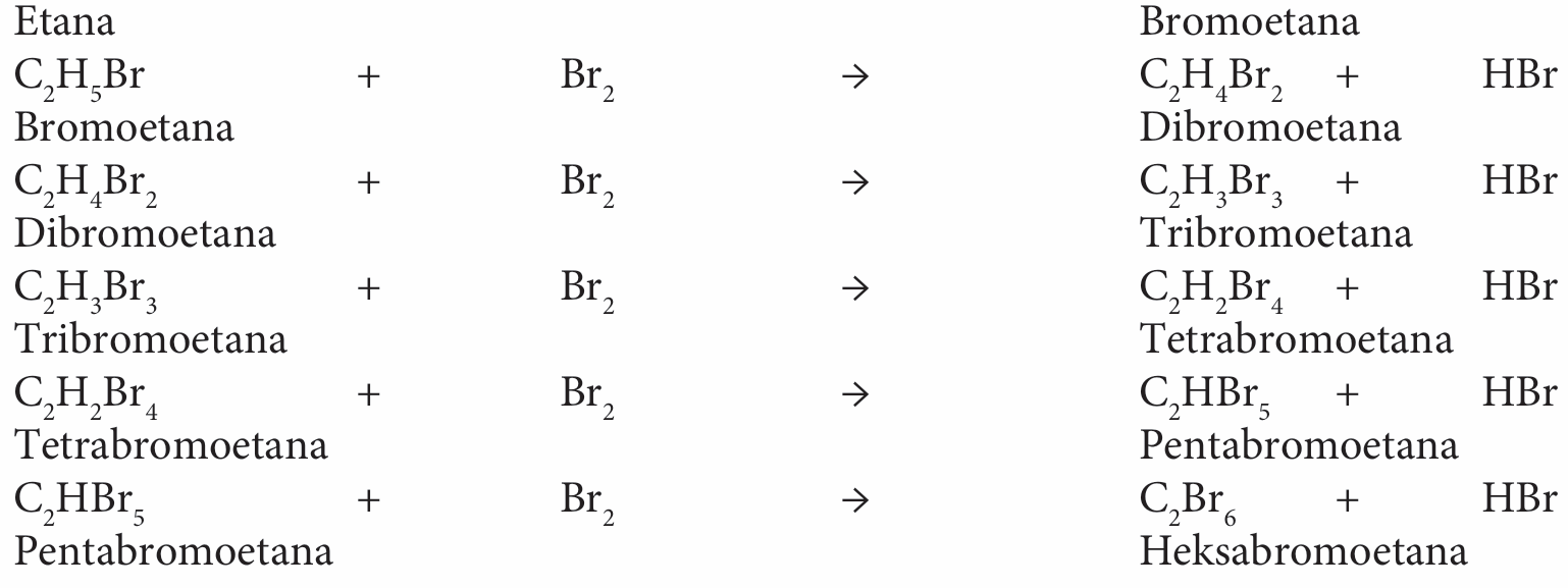 $$ \mathrm{C}_2 \mathrm{H}_6 \quad+\quad \mathrm{Br}_2 \quad \rightarrow \quad \mathrm{C}_2 \mathrm{H}_5 \mathrm{Br} \quad+\quad \mathrm{HBr} $$