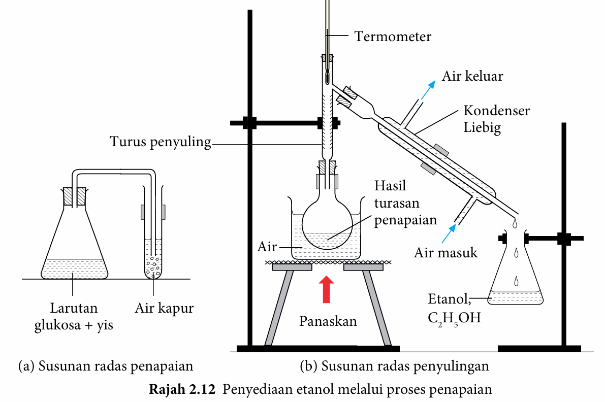 – Wap etanol yang terbentuk pada takat didihnya akan terkondensasi didalam kondenser Liebig dan seterusnya dikumpulkan di dalam tabung uji.