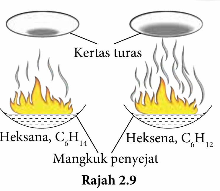 1. (a) Heksena terbakar dengan lebih berjelaga berbanding heksana.