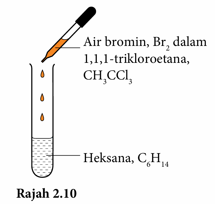 2. Tambah 2 – 3 titik air bromin, Br2 dalam 1,1,1-trikloroetana, CH3CCl3 kepada heksana, C6H14 seperti yang ditunjukkan dalam Rajah 2.10.