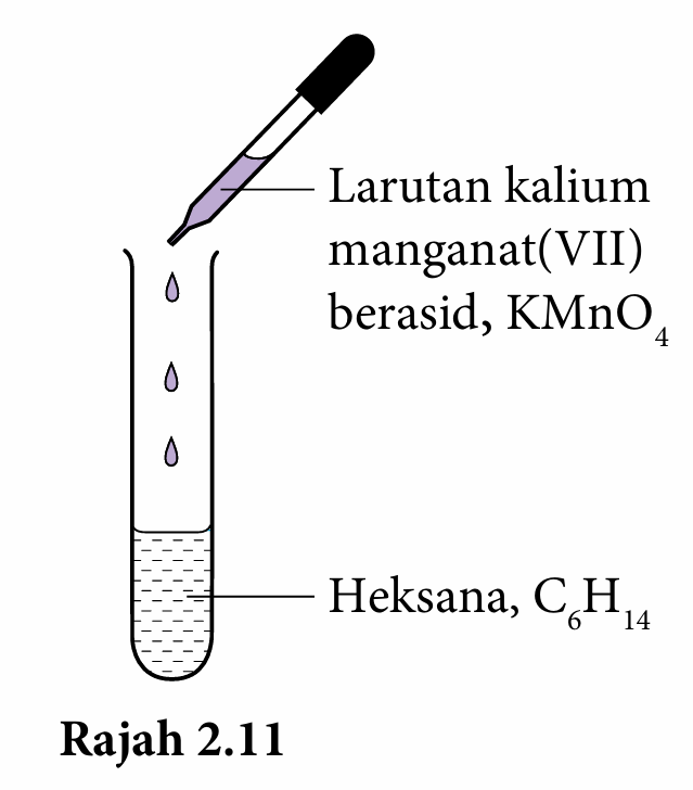 2. Tambah 2 – 3 titik larutan kalium manganat(VII) berasid, KMnO4 kepada heksana, C6H14 seperti yang ditunjukkan dalam Rajah 2.11.