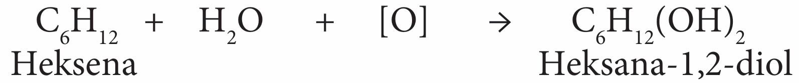 – Heksena adalah hidrokarbon tak tepu yang mengandungi ikatan kovalen ganda dua antara atom karbon, -C=C- . Tindak balas penambahan berlaku bila ditambah larutan kalium manganat(VII) berasid menghasilkan heksana-1,2-diol.