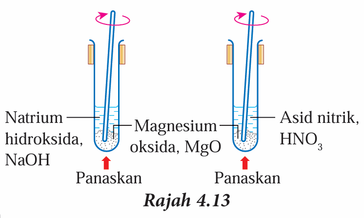 4. Panaskan kedua-dua tabung uji secara perlahan-lahan dan kacaukan dengan menggunakan rod kaca seperti yang ditunjukkan dalam Rajah 4.13.